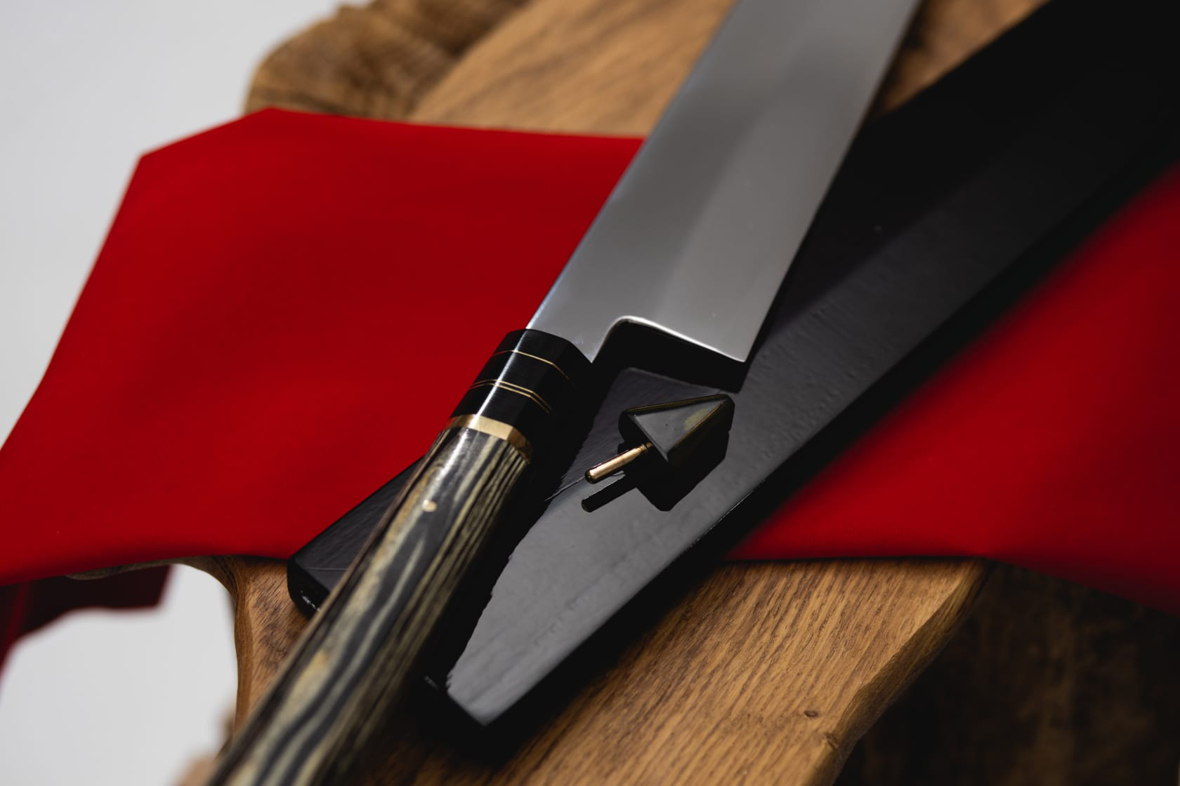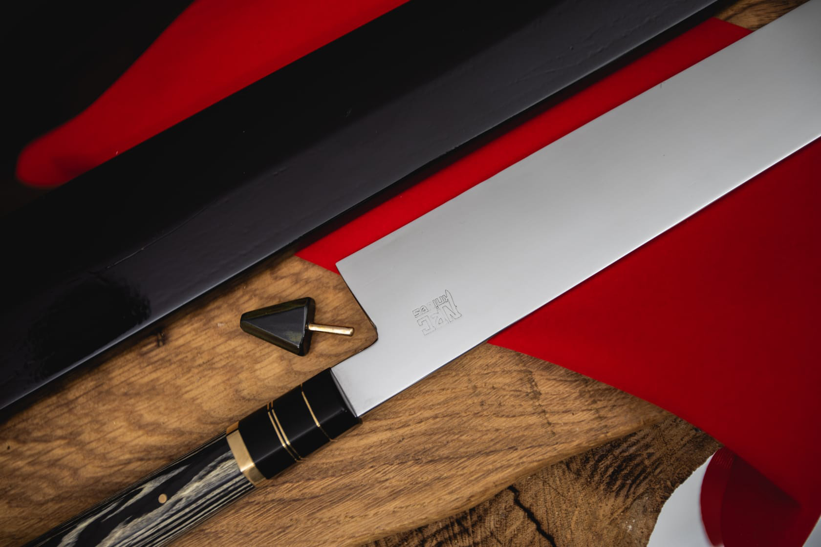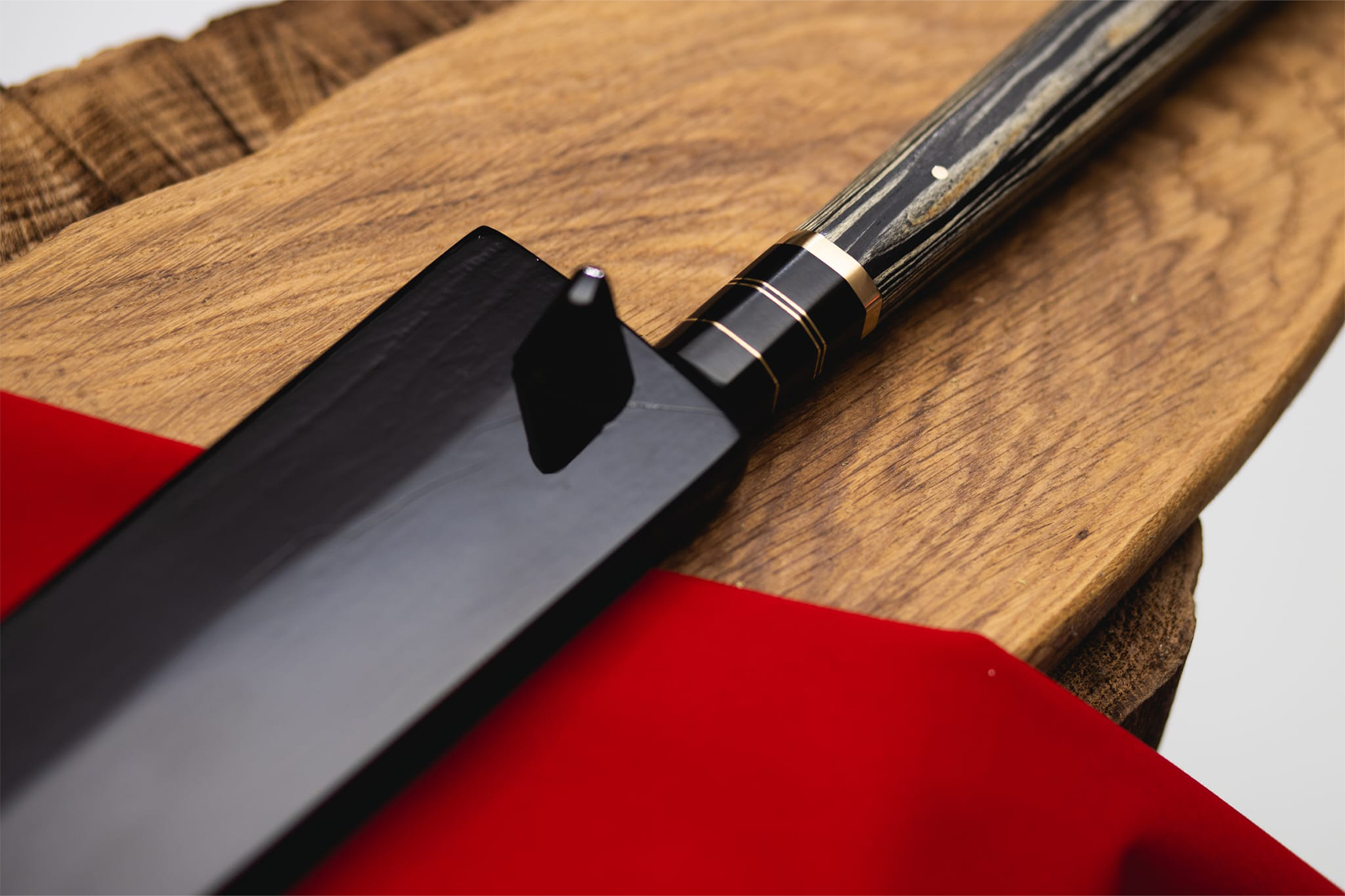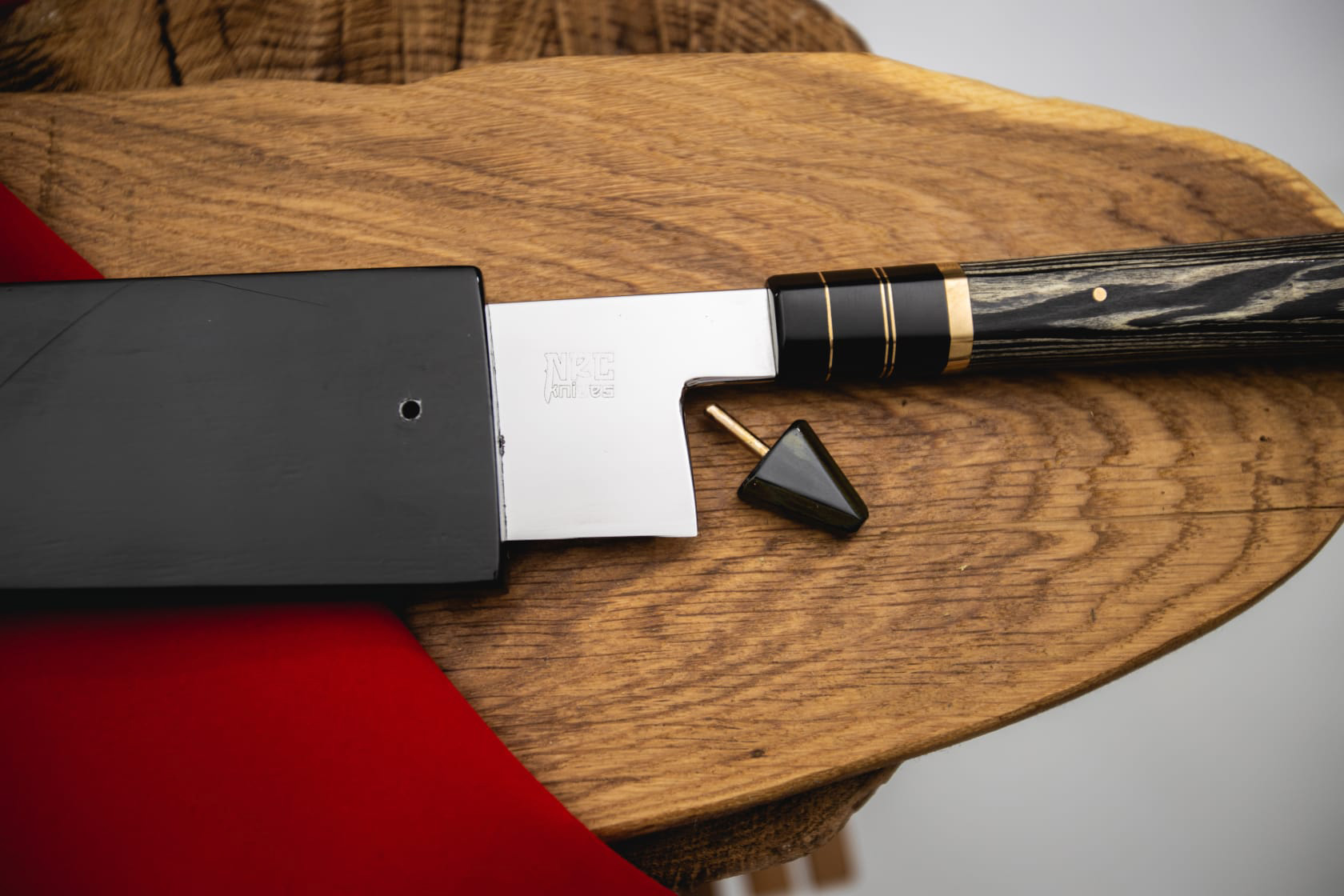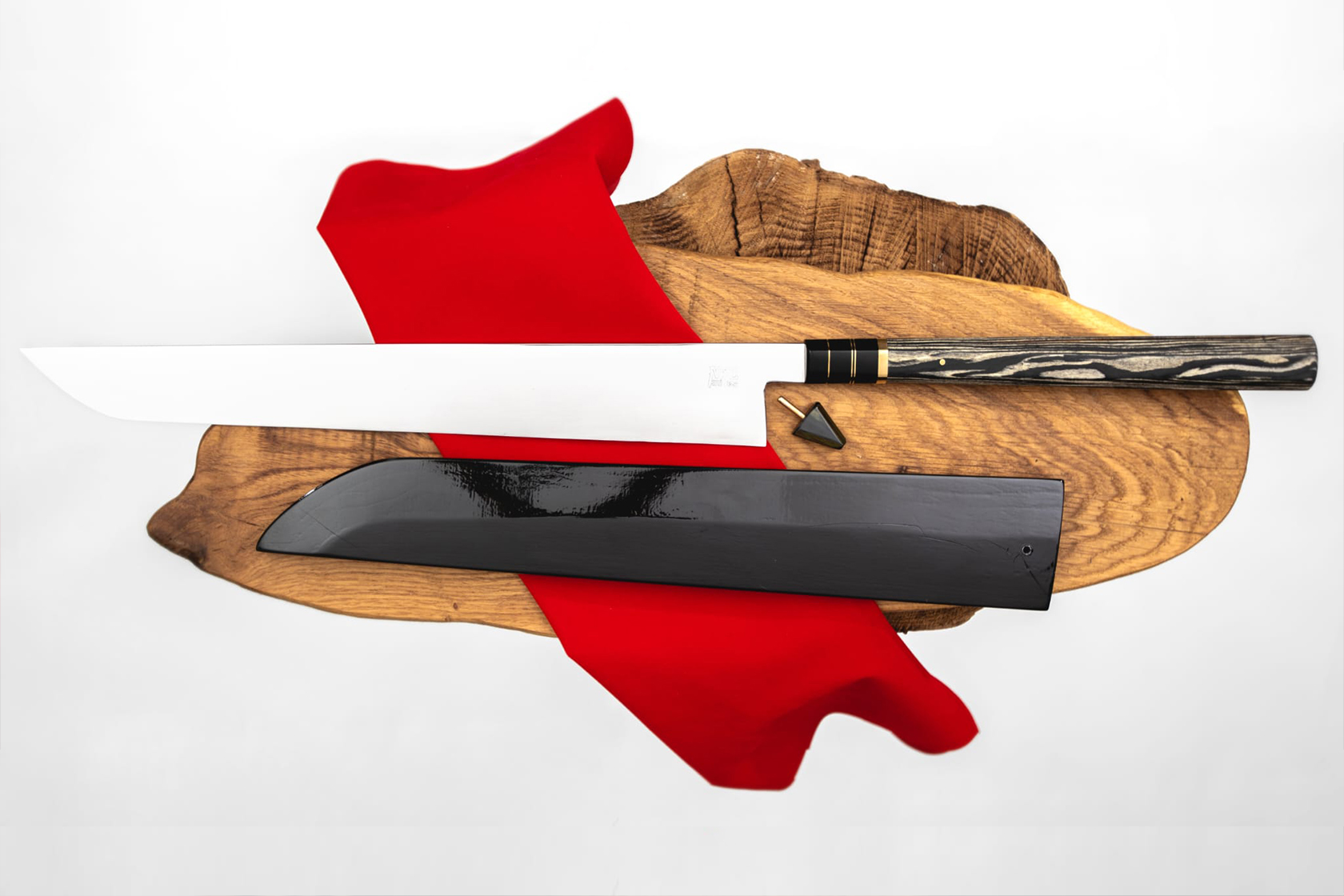 Acest cuțit japonez Maguro Bōchō este conceput pentru filetat tonul și peștii mari, având o lamă lungă din oțel 14C28N, renumit pentru duritatea ridicată, rezistența excelentă la coroziune și retenția superioară a tăișului. Mânerul de 28 cm este realizat din lemn recompus, decorat cu alamă și Corian negru, oferind stabilitate și eleganță. Teaca din lemn, lucrată manual și căptușită cu piele, protejează lama și completează prezentarea premium a cuțitului.