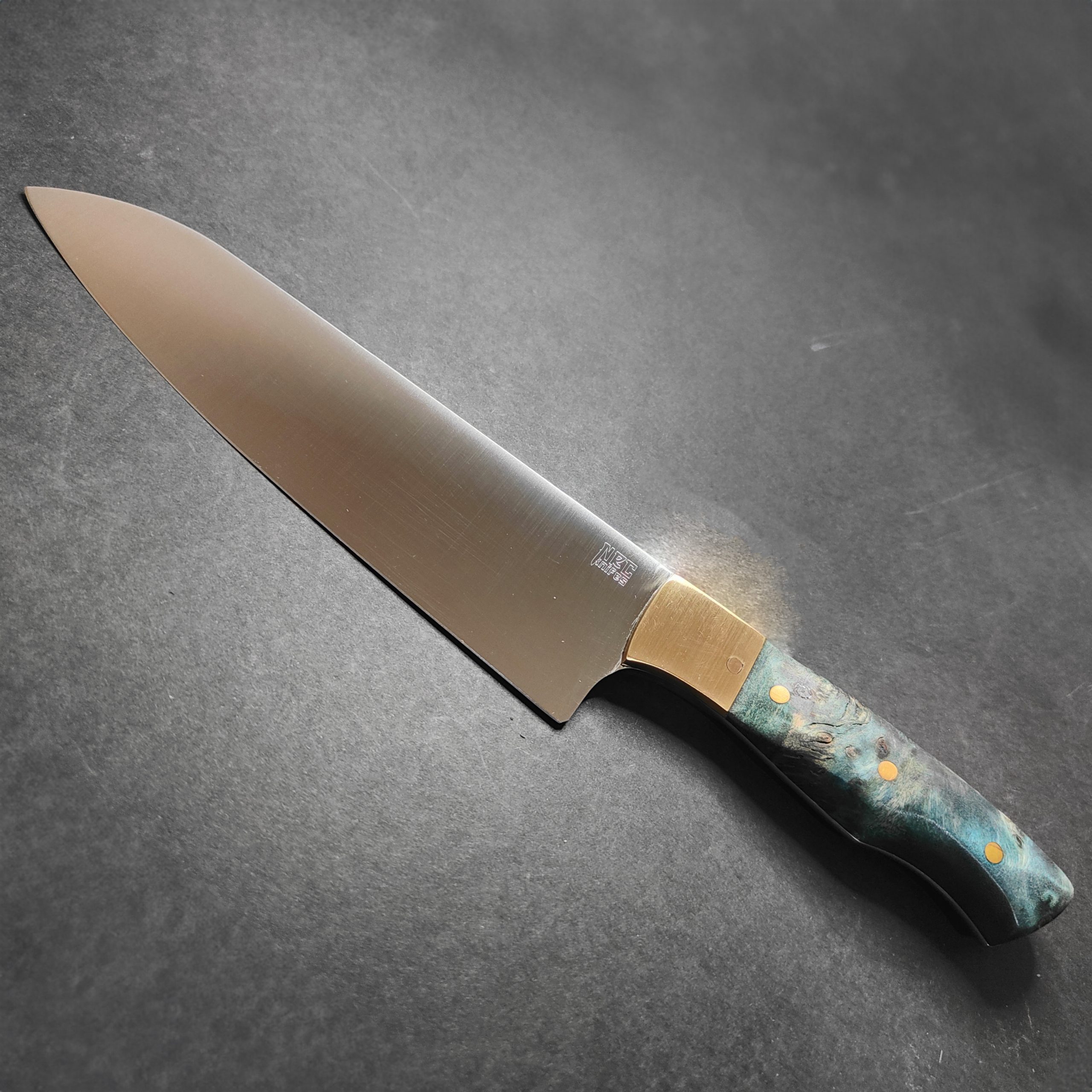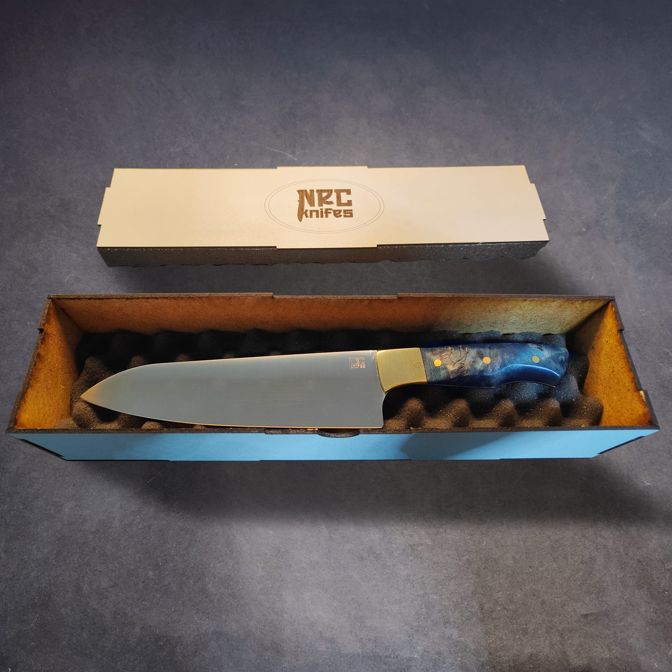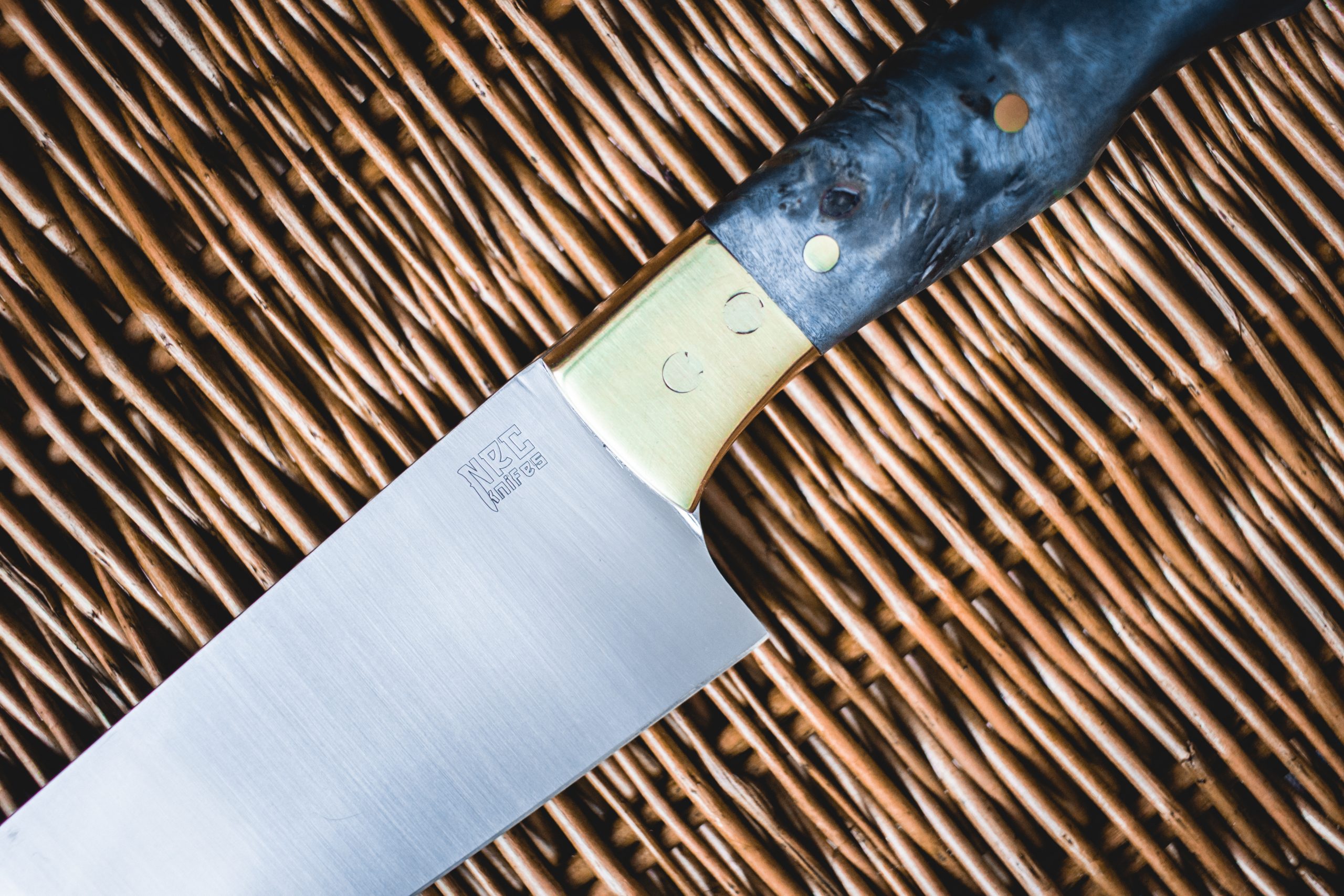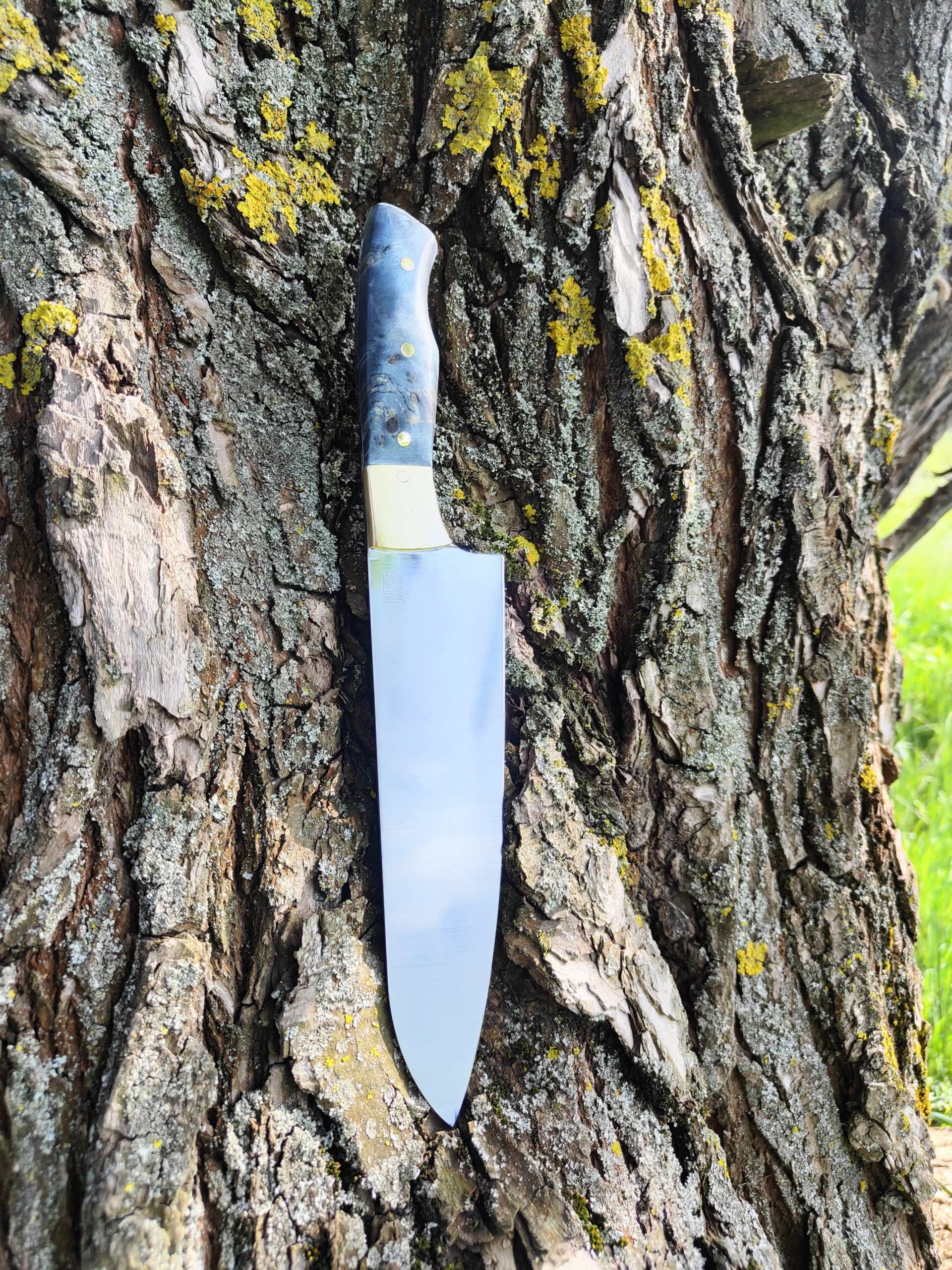 Cuțit Chef full tang, oțel 12C27, 57 – 58HRC, Gardă Alamă, Plăsele lemn stabilizat G. Musea cu pinuri alamă.