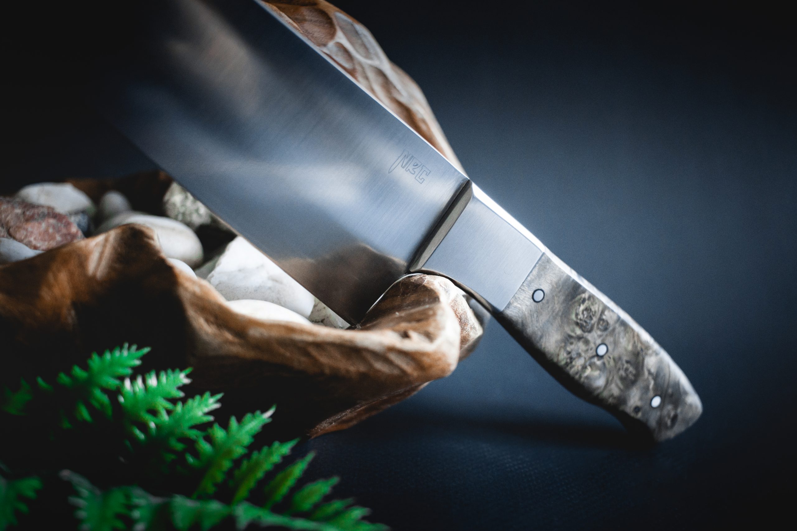 Cuțit Chef full tang, oțel 12C27, 57 – 58HRC, Gardă Alamă, Plăsele lemn stabilizat G. Musea cu pinuri alamă.