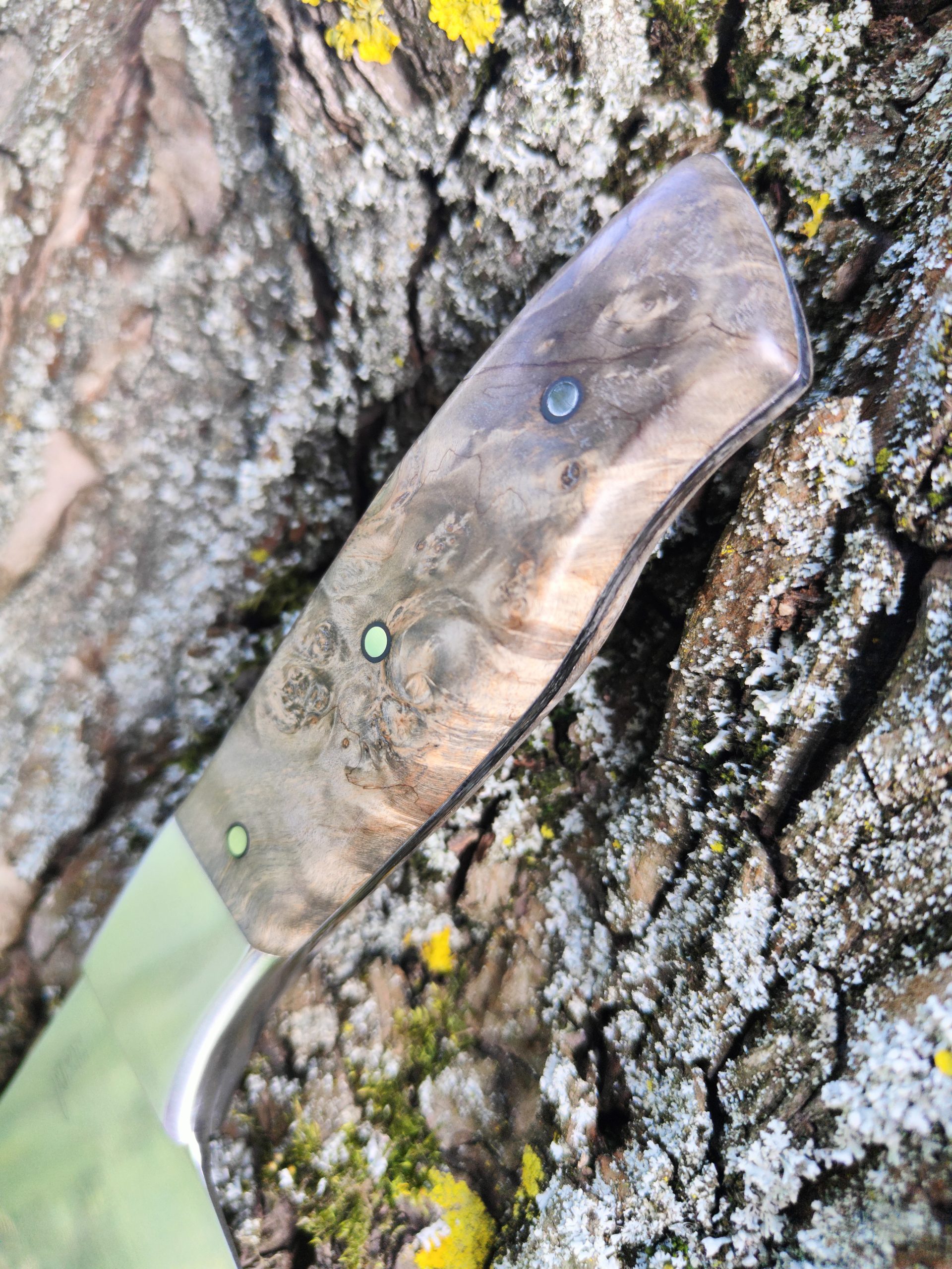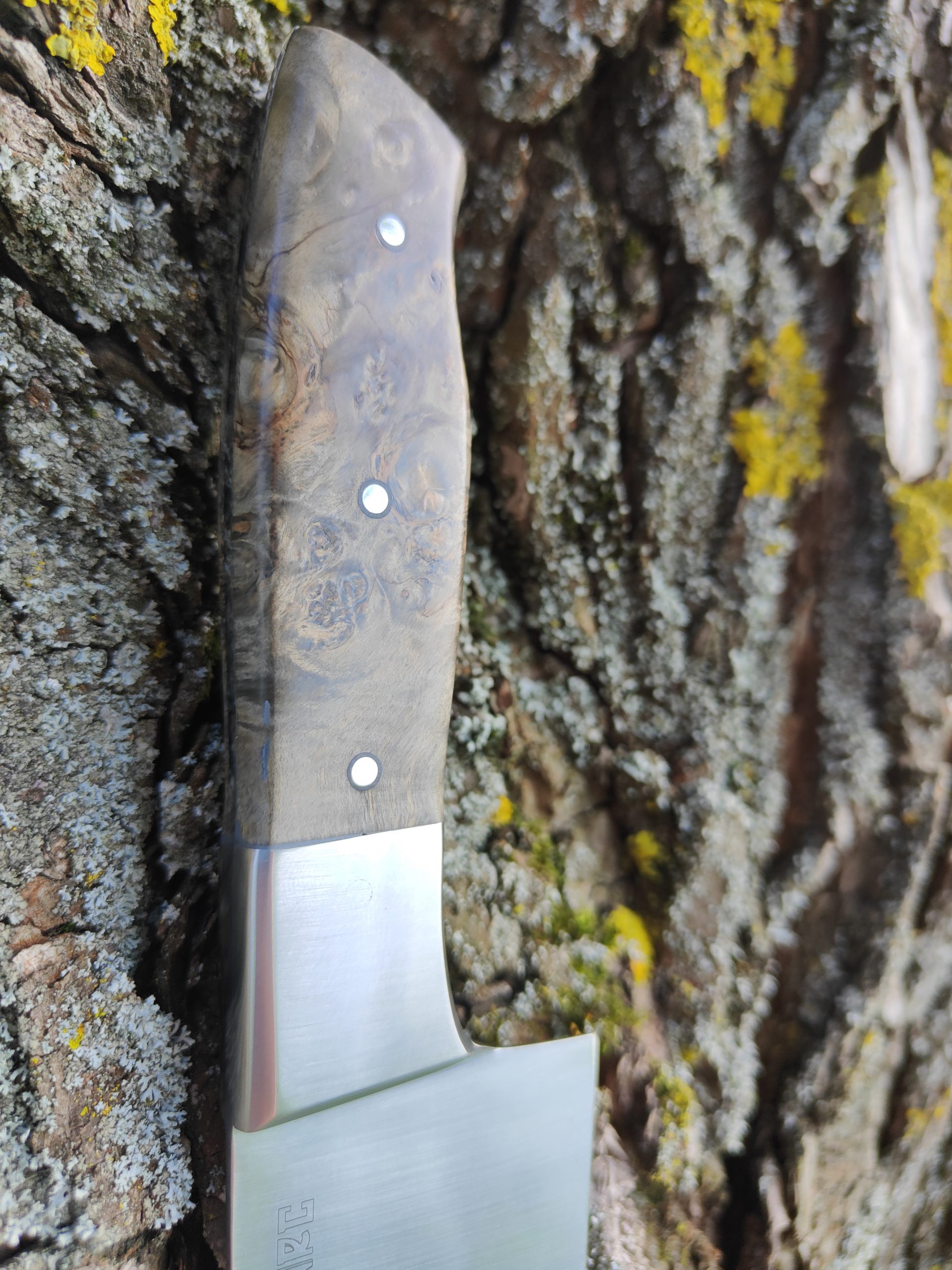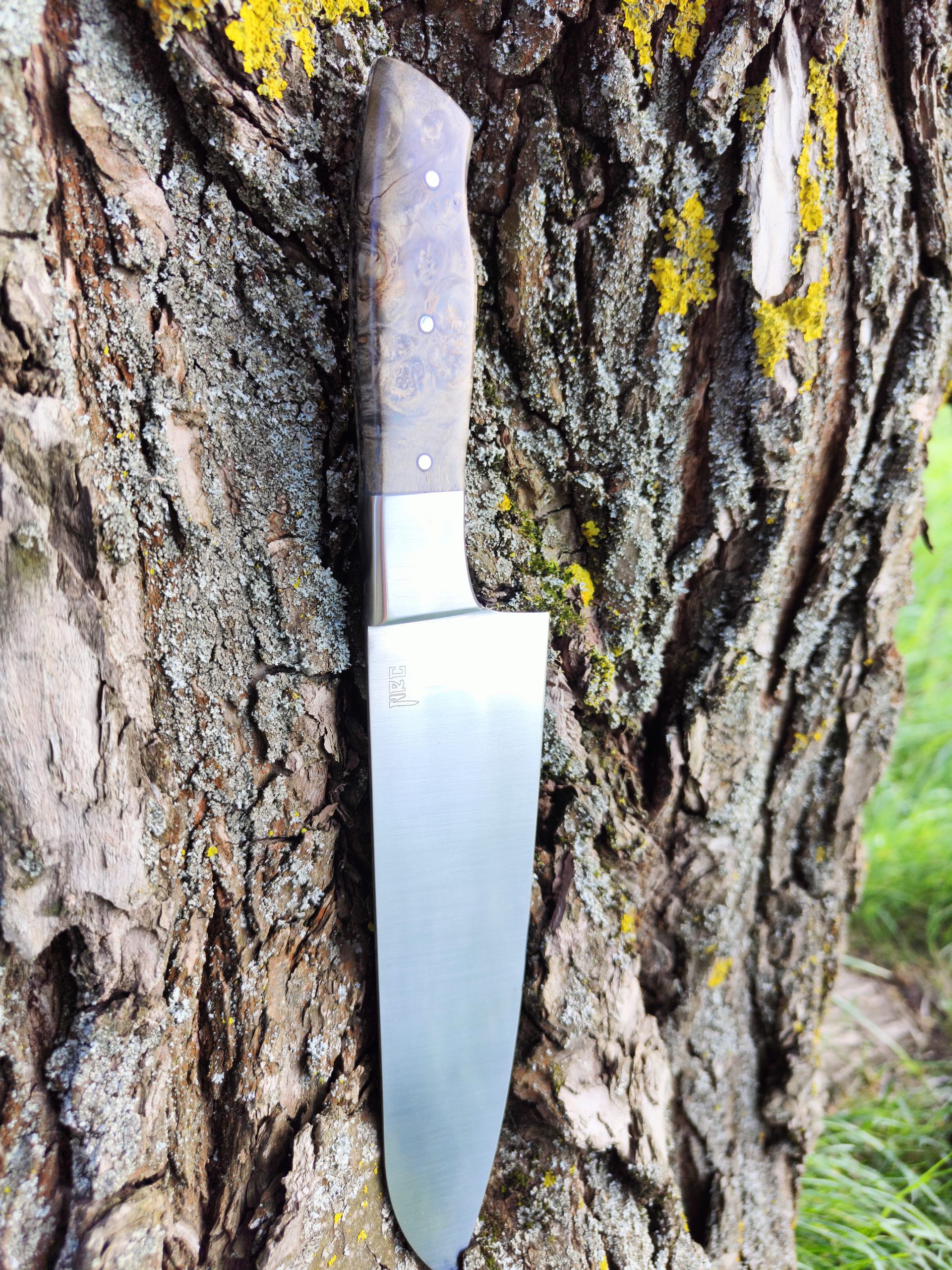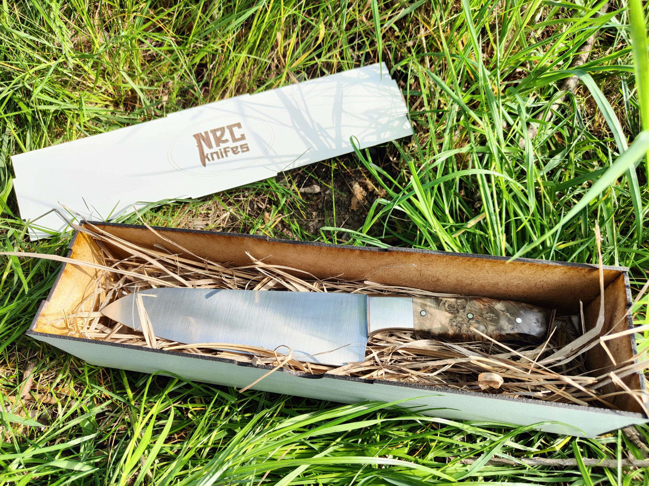Cuțit Chef full tang, oțel 12C27, 57 – 58HRC, Gardă Alamă, Plăsele lemn stabilizat cu pinuri de alamă. Greutate Apx. 200gr.